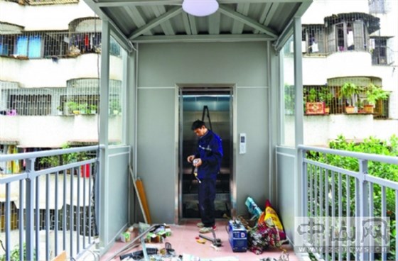 東區(qū)夏洋街63號(hào)舊樓電梯已經(jīng)安裝完畢,工人忙著進(jìn)行相關(guān)檢測(cè)工作。記者 文波 攝